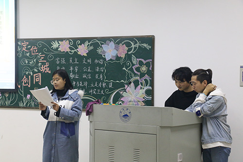 活动伊始,各支部主持人介绍本次主题团日活动开展的背景及目的,并且讲述文明礼仪的典故,增加同学们的兴趣。各支部班级板报各具特点,部分班级设置了有奖答题环节,团支书向班级成员提问有关社会主义核心价值观与共创文明城市的问题,同学们跃跃欲试,争先抢答。当团委组织部前去班级提问时,各班级在各班团干的带领下踊跃发言,现场十分热闹。