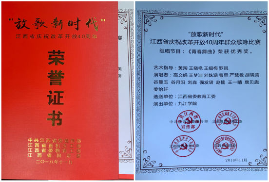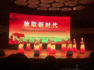 为深入贯彻落实习近平新时代中国特色社会主义思想和党的十九大精神,庆祝改革开放40周年,展现我省经济社会发展的伟大成就和人民群众良好的精神面貌,2018年岁末,省宣传部、省直机关工委、省委教育工委、省国资委共同举办了“放歌新时代”——江西省庆祝改革开放40周年群众歌咏比赛活动,由公司黄淘副教授等四位老师编排带队的组唱《青春舞曲》荣获优秀奖。