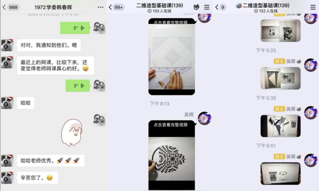 各专业教研室老师纷纷网络集中备课,调整教学方式及教案内容。在视传设计教研室,如副教授吴晖A1972班《二维造型基础》“线的构成”课堂数学中,她提前两个多星期就备好课并制定详细的计划,在给员工们示范教学中,做好如线的面化、线的平衡感构成、线的有序、线的无序自由构成等讲授与实践,且常在课后给员工们看作业答疑解惑,员工们对吴晖老师的网课竖起了大拇指。