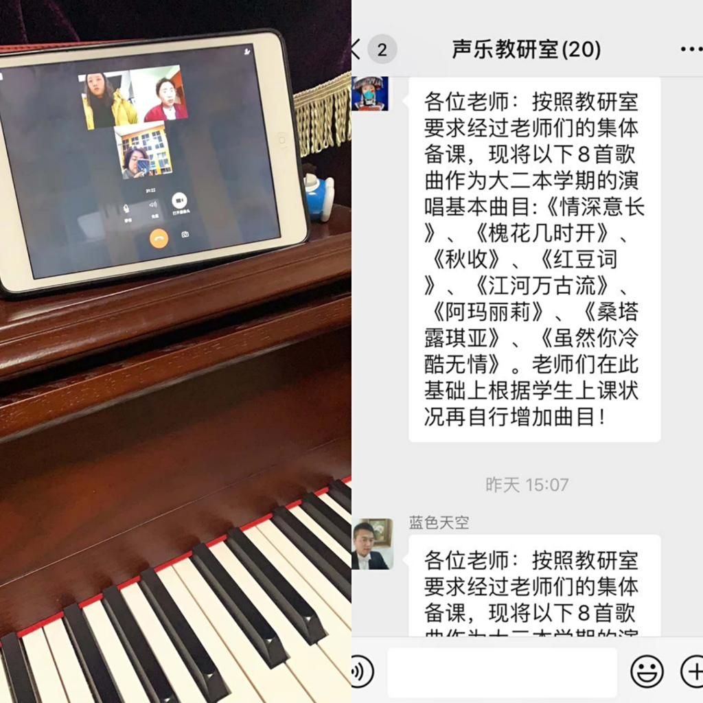 声乐教研室在网络授课期间,在基础教学的同时,把正能量的歌曲教授给员工,希望他们能够在学习的同时,也能有积极向上的心态面对疫情。孔江闽教师参与江西省及九江市多个抗疫歌曲的演唱,郭泗茂教师也创作录制了抗议歌曲并获得很好的反响。