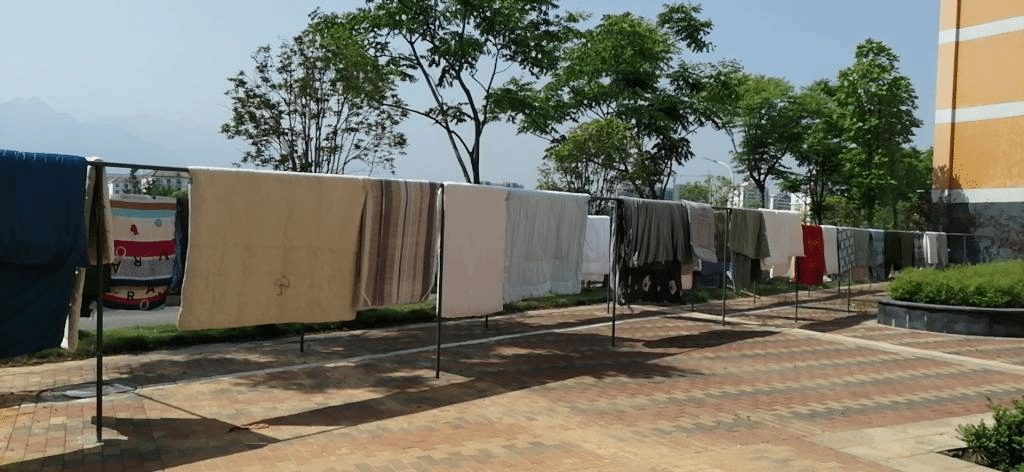 大面积大量地晒被子可不是一个轻松的活,每栋宿舍从1楼到6楼,有些被子还比较大比较沉,她们手抱着一趟趟来回上下楼梯,一天下来脚和手都酸了。但她们还是很努力,希望同学们的被子如阳光般温暖,不再发霉。