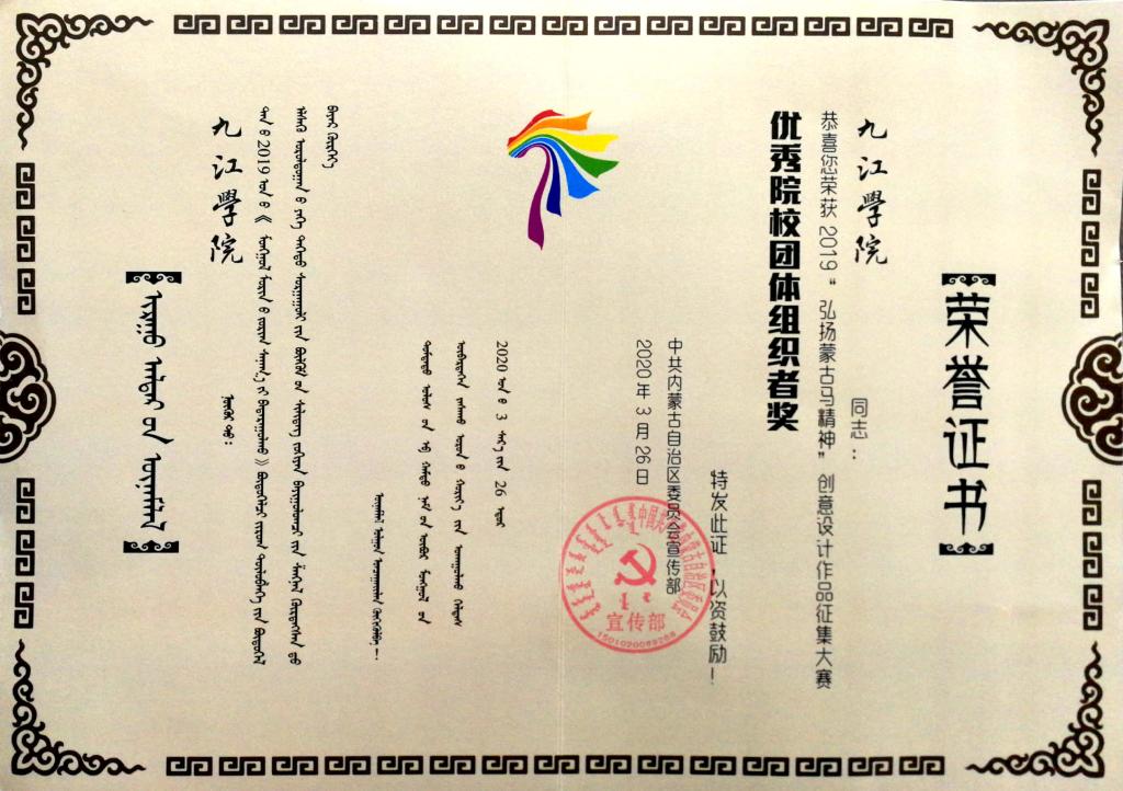 在内蒙古自治区委员会宣传部、文学与艺术界联合会主办的“蒙古马”设计大赛活动中,荣获优秀团体组织奖。