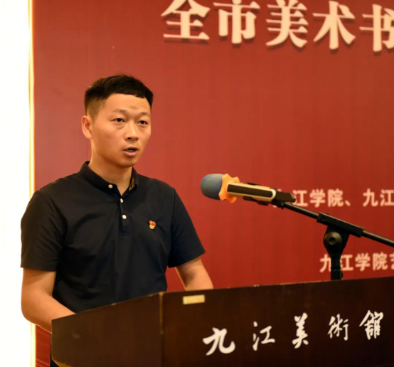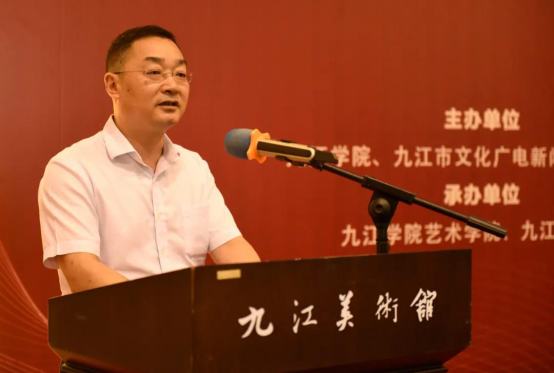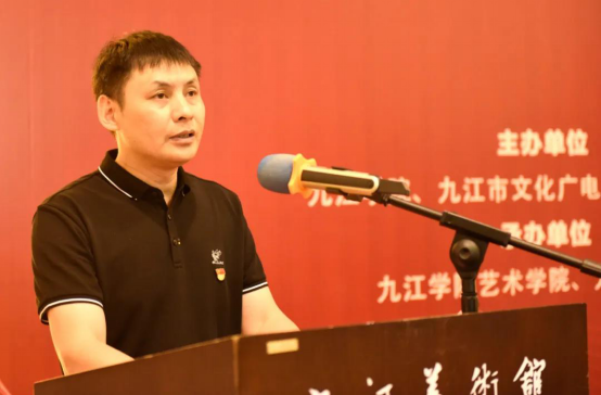 九江市文化广电新闻出版旅游局党委书记、局长徐卿在开幕式上致辞,他指出,习近平总书记在一系列关于文艺工作的重要论述中,将“文艺与中国梦”相联系,重申社会主义文化强国建设离不开新时代文艺繁荣发展,明确了新时代党领导下的文艺工作承担的历史任务,确立了新时代文艺工作的重要意义,即“为实现‘两个一百年’奋斗目标、实现中华民族伟大复兴中国梦提供强大的价值引导力、文化凝聚力、精神推动力”。在中国共产党百年华诞到来之际,组织举办《丹心向党——庆祝中国共产党成立100周年全市美术书法主题作品展》很有意义。本次参展作品从传统的艺术表现形式到贴近生活的设计,通过不同的视角维度与表达语言上展示了九江美术创作的新成果、新力量与新高度,体现了广大艺术家和艺术工作者的责任担当和光荣使命,必将进一步激发人民群众的爱党爱国热情和坚定走中国特色社会主义道路的信心。