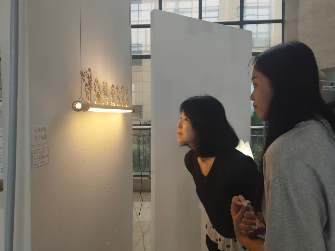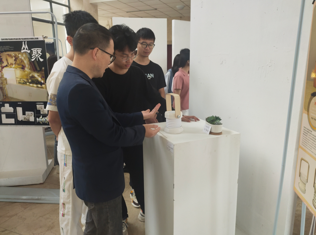 开幕式后,各位领导、教师和同学参观了灯具产品创新设计作品。观展过程中领导、老师和同学们进行了深入交流,即肯定了设计作品的创新性,也给出了诸多宝贵意见。通过现场交流,同学们也受益匪浅,表示很高兴领导、老师和同学们能喜欢他们的作品,同时获取的宝贵意见也为未来设计改进指明了方向。