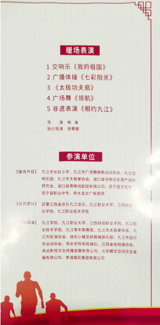 11月8日晚,万众瞩目的江西省第十六届运动会开幕式在九江市体育中心隆重举行。四年一届的江西省运动会,第一次由九江市独立主办完成,这是九江的一件大事,是全省人民都在关注的焦点。九江交响乐团、九江青年歌舞团应组委会邀请参加演出。经过精心准备、刻苦排练,圆满完成了开幕式的表演任务,得到了导演组的高度肯定和观众的一致好评。
