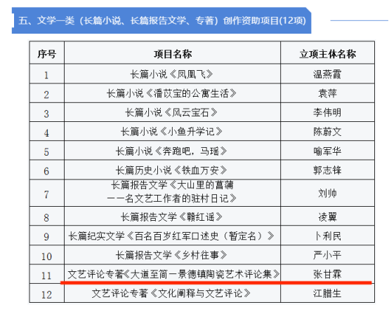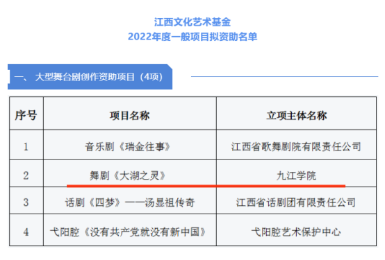 公司大型舞台剧《大湖之灵》、《九江组曲》一夜空银河与瀑布交织的烟火、群舞《瑶光赋》、张甘霖文艺评论专著《大道至简一景德镇陶瓷艺术评论集》入选江西文化艺术基金2022年度一般项目立项,位列全省前列。