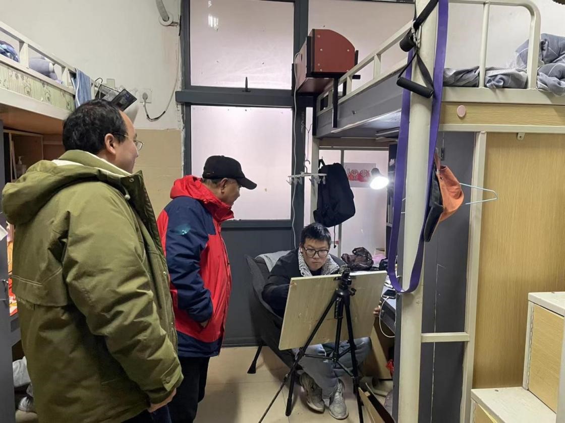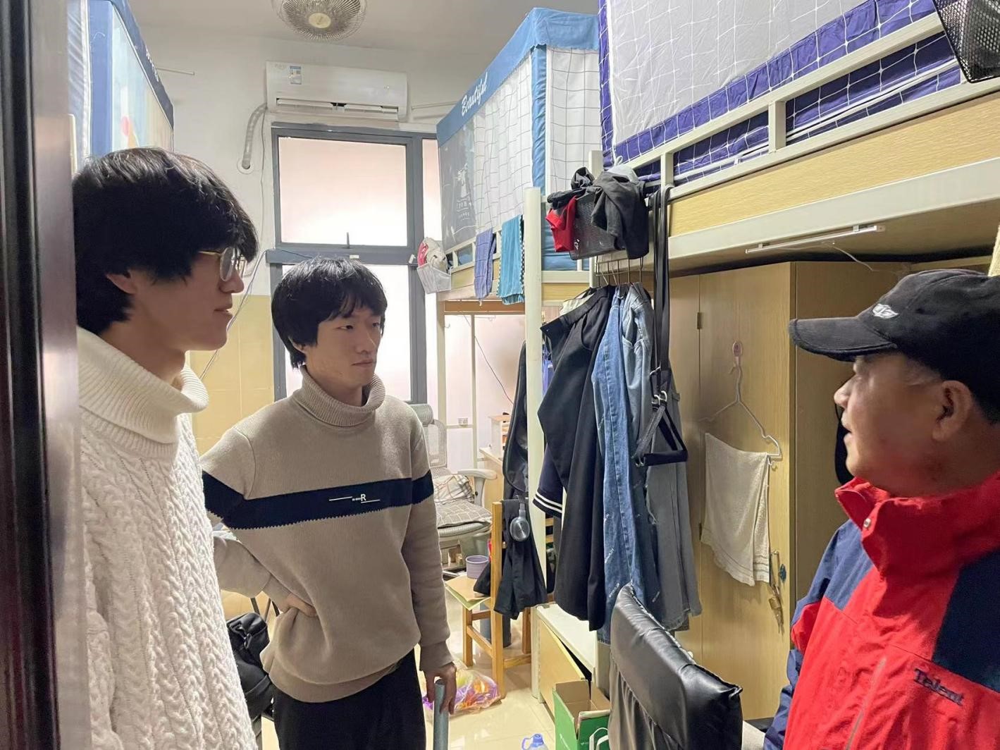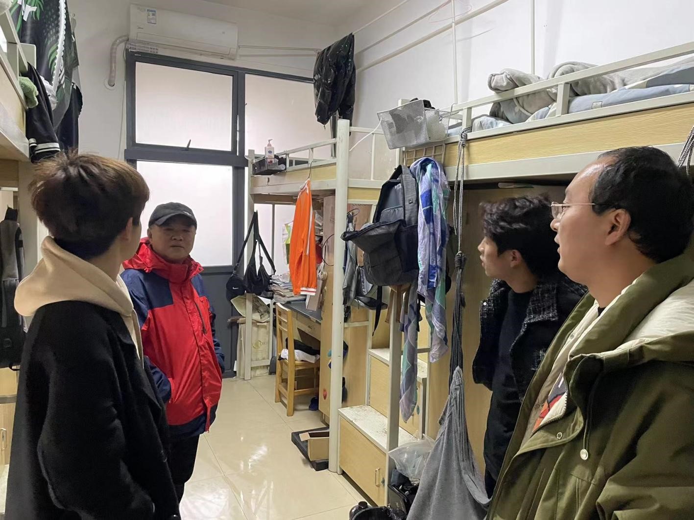领导和老师们每到一间宿舍,一一和同学亲切交谈,不厌其烦地询问宿舍人员的返校情况,旅途是否顺利,“阳”了没有,现在感觉咋样,下星期进行考试,准备得如何等等……对极个别卫生脏乱的宿舍,叮嘱他们开窗开门通风换气,清扫垃圾,整洁住宿环境。
