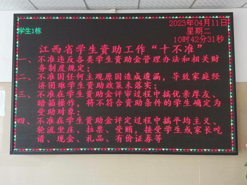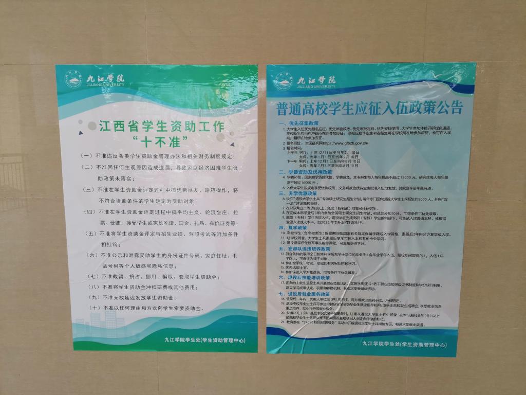 威廉希尔足球官方网站员工科按照员工处(员工资助管理中心)的要求,于4月11日上午分别在员工宿舍一栋和艺术大楼宣传栏张贴《江西省员工资助工作“十不准”》和《普通高校员工应征入伍政策公告》,在五个电子屏滚动宣传《江西省员工资助工作“十不准”》。并分别召开辅导员班主任会议,传达和学习学校2023年员工资助工作专题培训会会议精神。通过学习和宣传,使员工资助政策上墙,使《高校国家奖助学金政策》入脑,使《江西省员工资助工作“十不准”》条例深入人心。